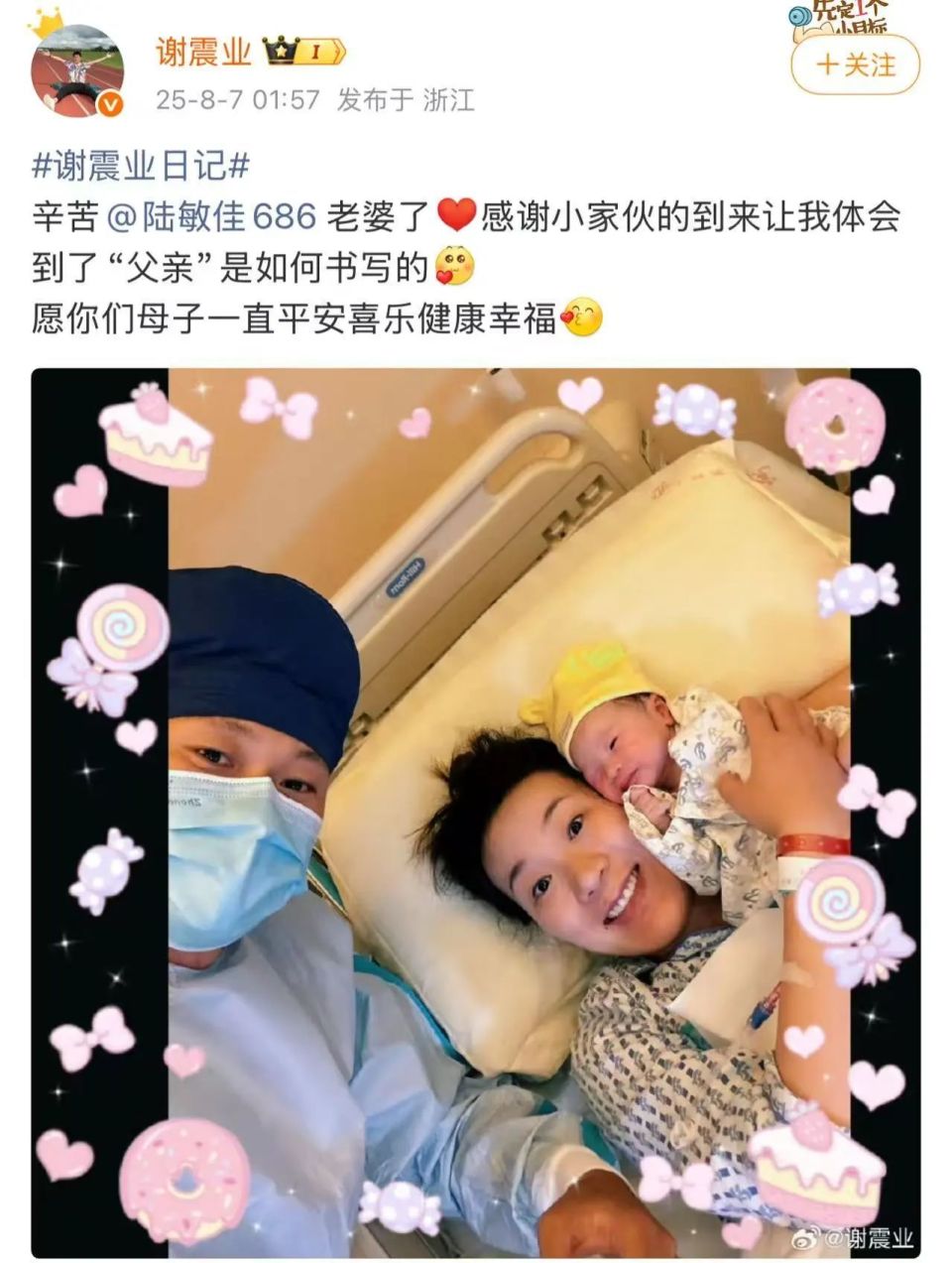 谢震业表示:“辛苦老婆了,感谢小家伙的到来让我体会到了‘父亲’是如何书写的,愿你们母子一直平安喜乐健康幸福。”